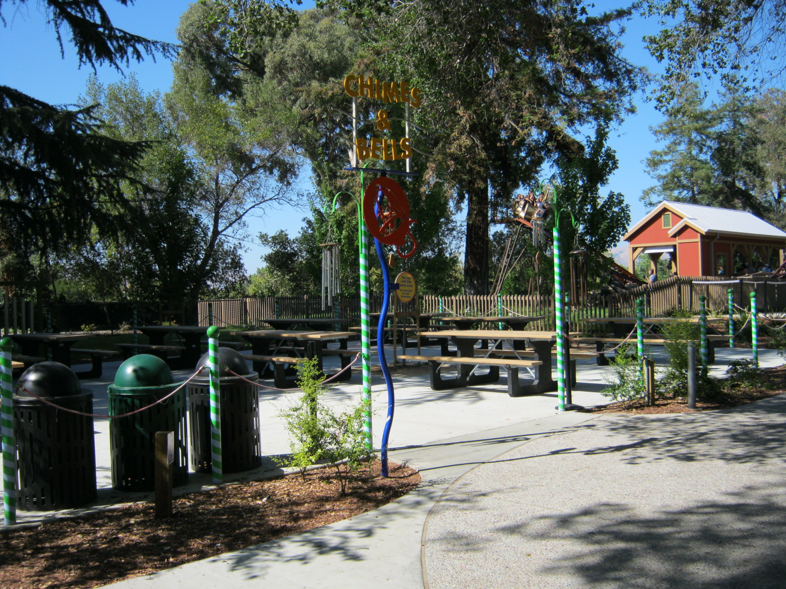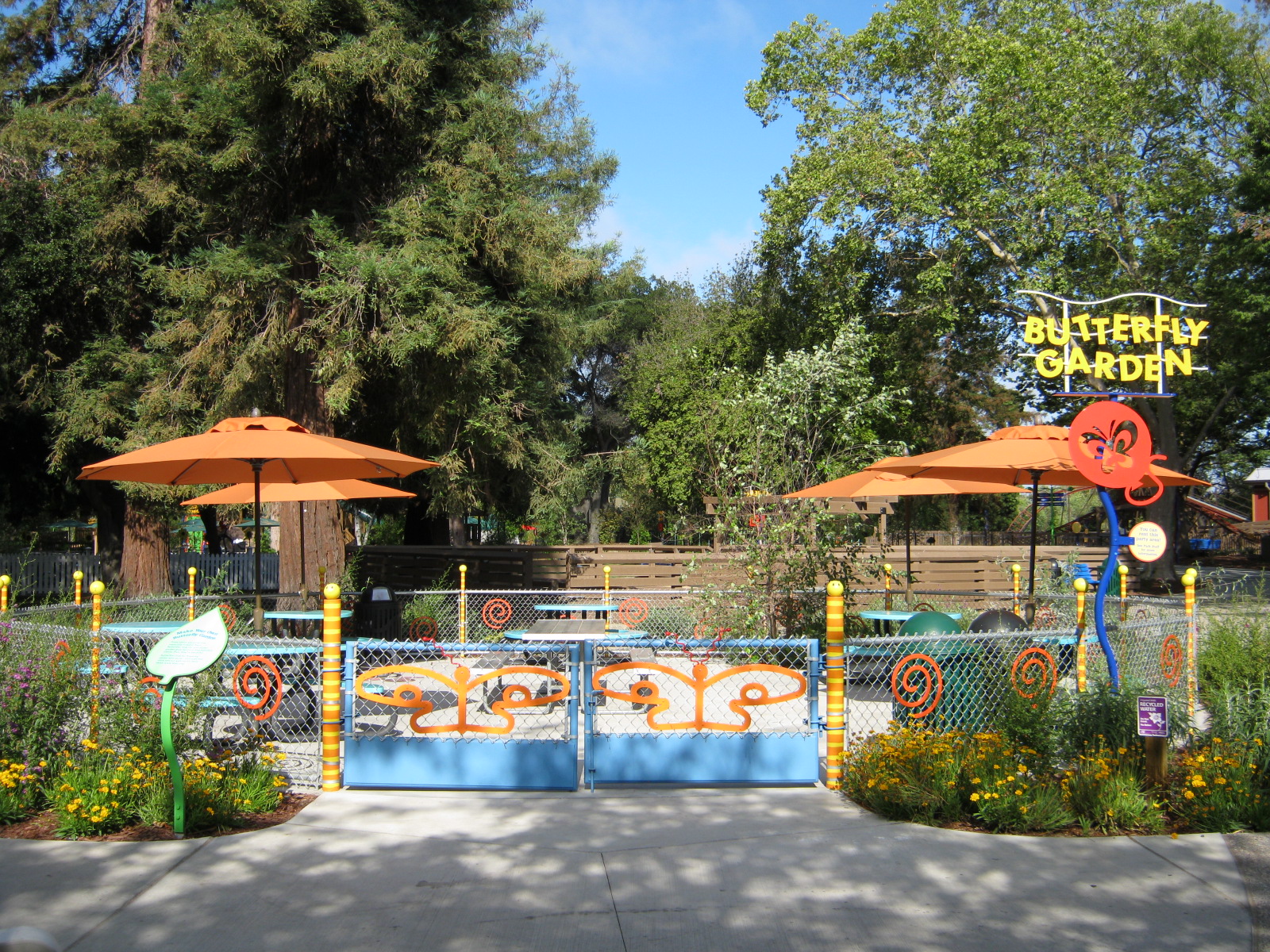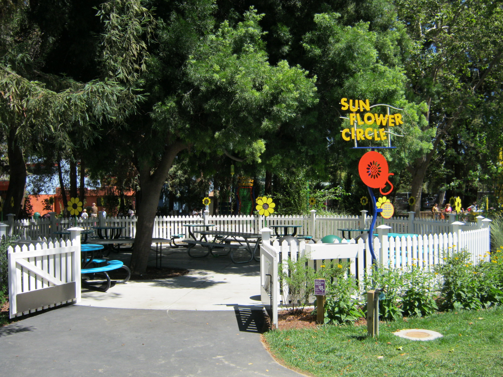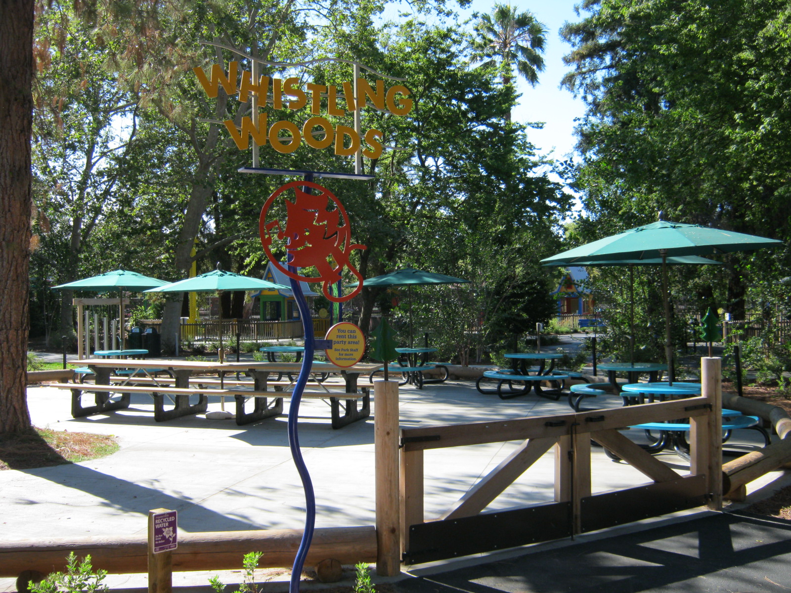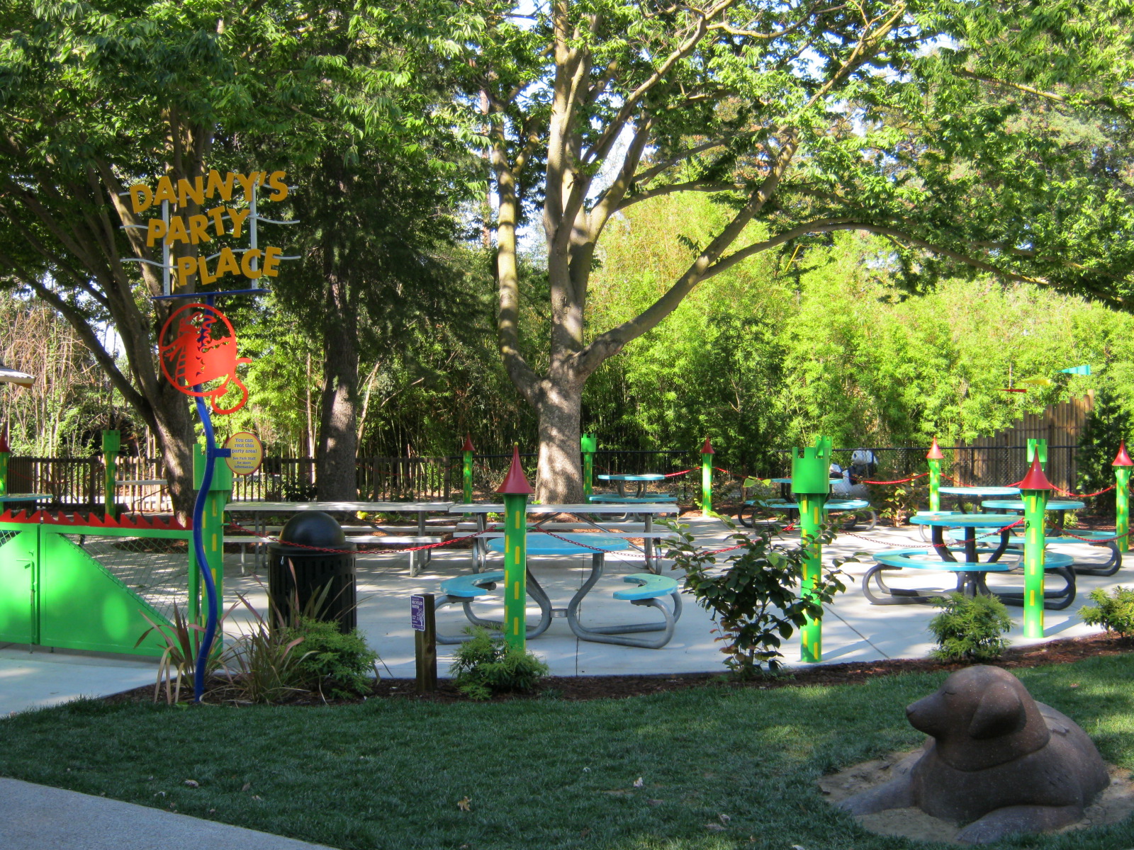 Near Danny the Dragon | 8 round tables (5 with umbrellas) & 2 picnic tables | Max Occupancy: 80 people | Full Natural Shade