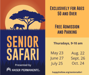 Senior Safari is designed to help older adults improve their health, avoid social isolation and enjoy a unique environment that stimulates both mind and body. Senior Safari admission and parking are free, and guests are welcome to stay for the day after gates open to the general public. Guests who enter before 10 a.m. may stay the whole day for free!